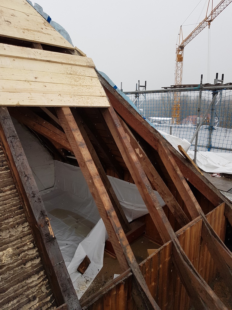 Dachdeckerarbeiten im Bereich des Wohnhauses und des Überganges vom Wohnhaus zum Ratsaal. In diesem Bereich wurde die Schalung ausgetauscht und die Dachfläche im Anschluss daran mit Bitumenbahnen abgedichtet