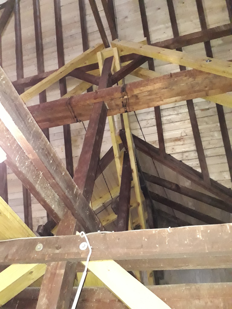 Zimmerarbeiten die die neuen Verstrebungen und Stützen zur Stabilisierung des Daches über dem Ratssaal zeigen